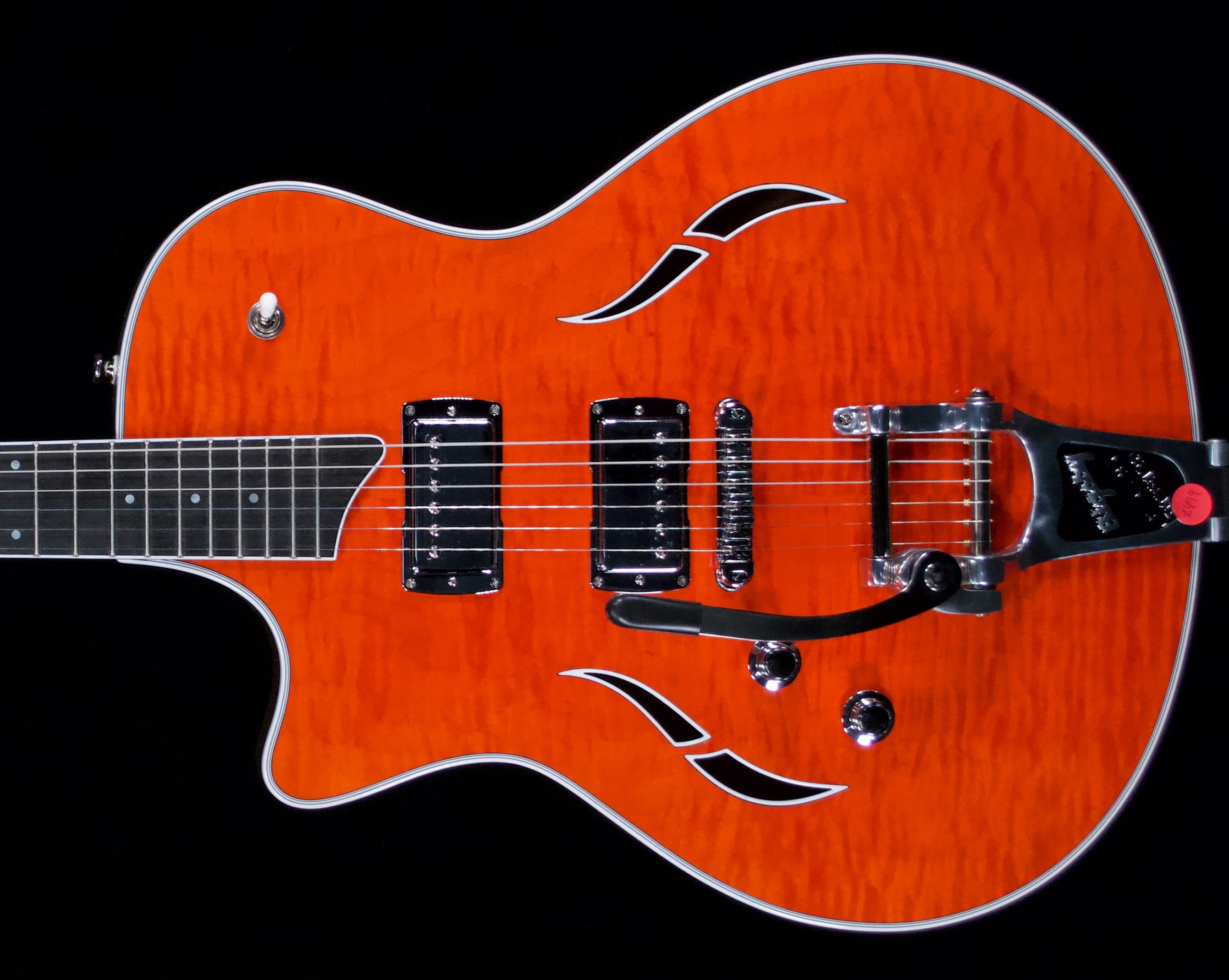 TThe Taylor T3B Orange Flame Top combines classic rockabilly style with modern playability. Its striking orange flame maple top not only offers a visually stunning appearance but also enhances tonal brightness and clarity. Designed for versatility, this semi-hollow electric guitar delivers rich, warm tones ideal for blues, rock, and jazz. Equipped with a hard case, it ensures secure transport and protection. Perfect for discerning players seeking a blend of vintage aesthetics and contemporary performance.
