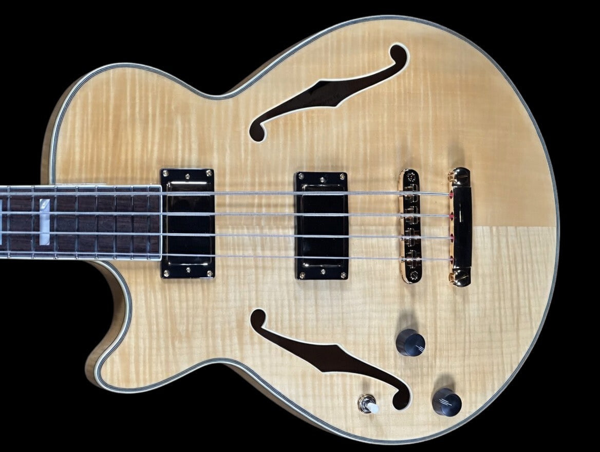 The D’Angelico Excel Bass for left-handed players features a semi-hollow design, enhancing tonal richness and sustain. Its construction supports optimal resonance, making it suitable for a variety of genres. This instrument is engineered to provide superior playability and sound quality, ideal for both practice and performance settings. Hard case included
