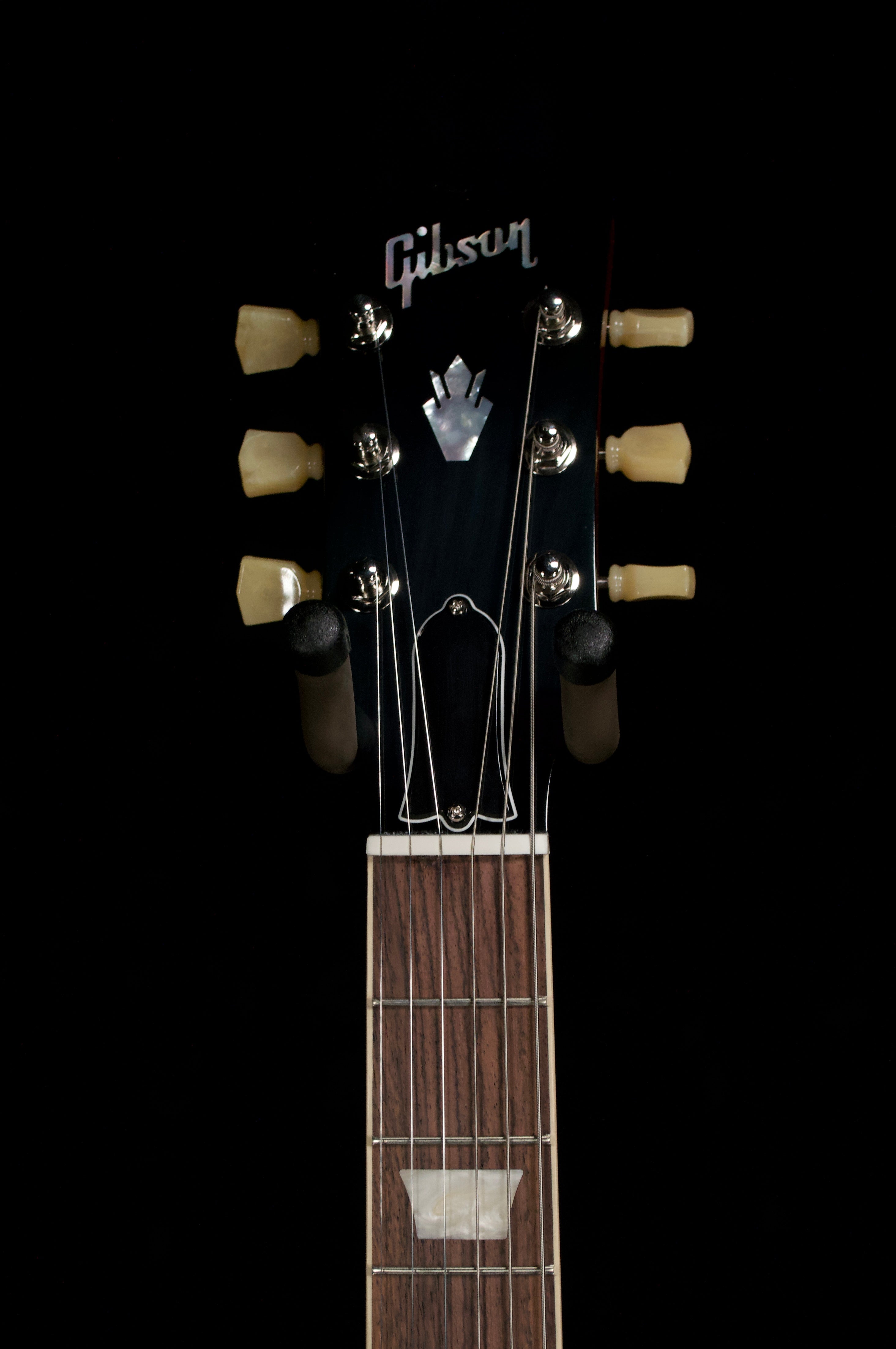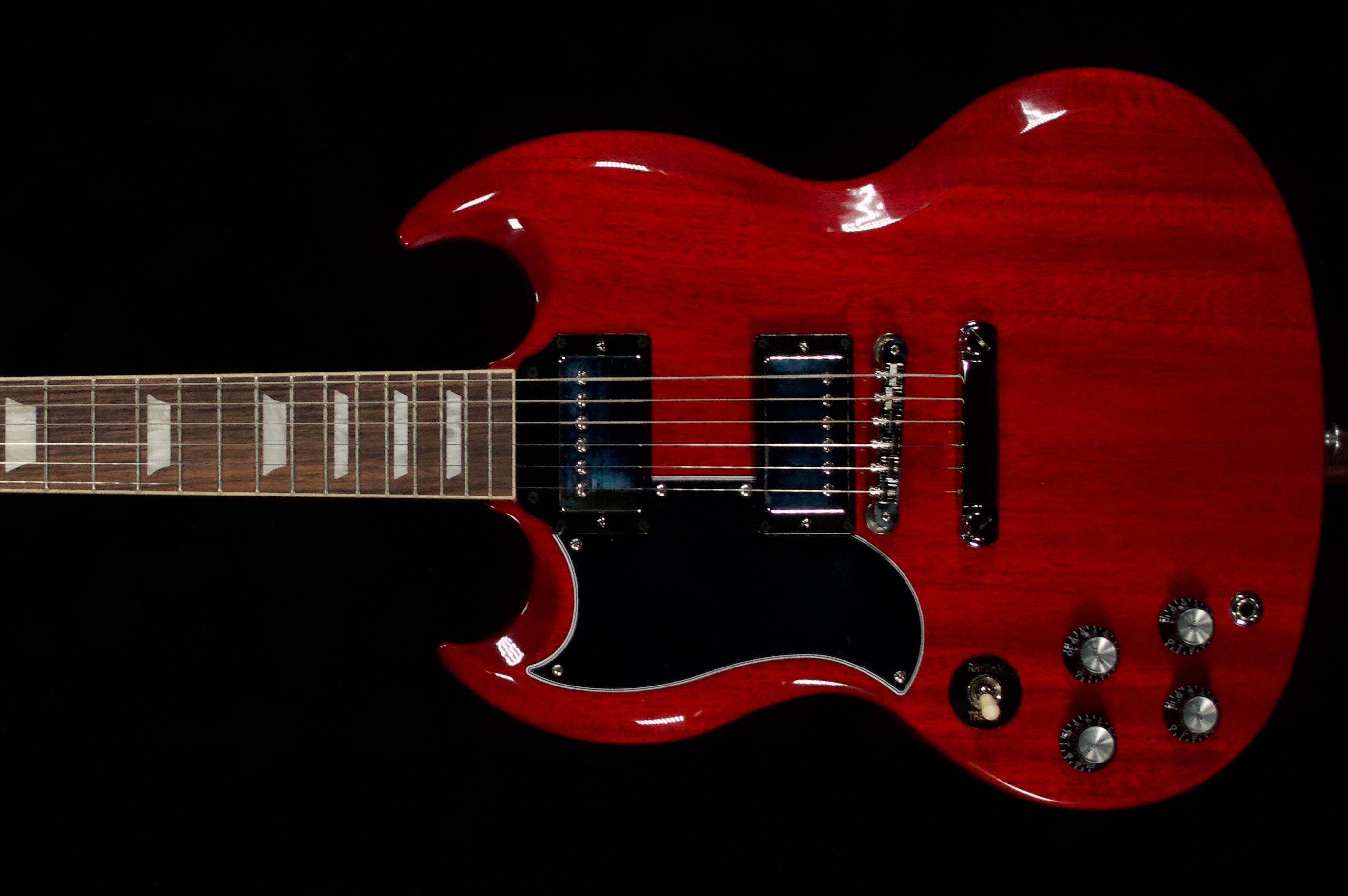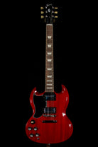 The left handed Gibson SG Standard '61 reissue is a reproduction of the original 1961 SG, featuring a lightweight mahogany body, a SlimTaper mahogany neck, and a bound rosewood fretboard. It has a small, 5-ply pickguard, a Tune-O-Matic bridge, and a stopbar tailpiece. The reissue is equipped with modern features while paying homage to its vintage predecessor, including a hand-wired circuit with two '60s Burstbucker humbucker pickups.